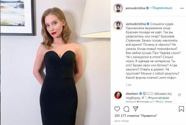 Стоит отметить, что в публикации звезда также прошлась по слухам о ее возможном романе с актером Алексеем Чадовым. "Слишком худая. Одинаковое выражение лица. Красная помада не идёт. Так вы развозитесь или пиар? Красивая. Стрёмная. Зачем голову наклонять всё время? Почему в чёрном? Не узнала. Когда новый порнофильм? Без мейка лучше. Про Чадова слухи? Чё с конкурсом в итоге? С*ськи норм. В одежде не интересна. Ты кто? Брови свои или ботокс? А где хештеги? Ответь в директ. Чё грустная? Можно с тобой замутить? Какой фирмы платье?..Хотя пофиг", - говорится в публикации Асмус. Пользователи мгновенно отреагировали на пост и поддержали Кристину Асмус. "Наверное каждая женщина столкнулась с подобной критикой", "Красивым женщинам всегда завидуют и желчью брызжат", "Вы очень классная! Остальные пусть молча завидуют!", "И зачем вы перечислили мои вопросы?", "Ты просто прелесть", "Все идеально", "Все супер, красотка!", "Кристина, ты классная! Не слушай никого! Эксперементируй с образом, если хочешь!", "Все начинается с уверенности в себе, тогда никто таких вопросов задавать не будет", "Крис, ты неповторимая", "Люди зависливы и злы посвоей природе. Забей на троллей. Живи для себя", "Да ты успокойся! Чего завелась-то?!", - написали они в комментариях. Ранее в сети появлялись слухи о том, что кристина Асмус закрутила роман с актером Алексеем Чадовым. Артистка во время самоизоляции не теряла время даром и кардинально изменила свою повседневную жизнь. Помимо роли в проекте, Асмус была окружена вниманием другого представителя российского шоу-биза в лице Алексея Чадова, который является режиссером и сценаристом фильма "Джон". Напомним, разрыв Харламова с Асмус получил неожиданный поворот: «Развелся ради этой…». Как сообщала Politeka, Асмус застукали с красавчиком и кучей подарков после расставания с Харламовым. Также Politeka писала, что Асмус после расставания с Харламовым раскрыла, как развлекается с коллегами в курилке.