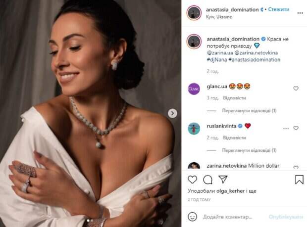 net. На фото Анастасия позирует в белой рубашке, приспустив ее с плеч. На шее и руках девушки изысканные украшения, а взгляд опущен вниз. Красотка улыбалась и не стеснялась себя показать, поэтому снимок получился довольно пикантным. Образ дополнил изысканный мейкап, который придал облику гармонии. "Краса не потребує приводу