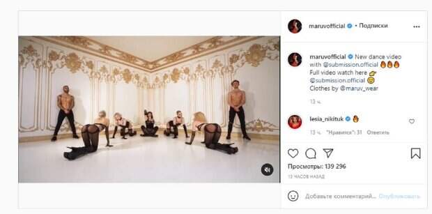 Все девушки были в прозрачных нарядах и сапожках. Вместе с MARUV красотки исполняли довольно провокационный танец, а в какой-то момент к ним присоединились два молодых человека. "Новое танцевальное видео", - подписала ролик на английском Анна. "Огонь", - написала сразу под видео Никитюк. Фанаты посмотрели ролик более 100 тысяч раз и написали комментарии: "Вау, очень круто", "Бордель прямо", "В чем красота то? Куда мы катимся?", "Одни и те же движения из клипа в клип...наймите уже хореографа что-ли", "Красиво, спортивно, эффектно", "Боже мой, что я сейчас увидела, это просто невероятно красиво!!!!!", "Я бы сходила на ваш балет", "Почему всегда слишком вульгарно?", А так все круто начиналось. Сейчас все ужаснее с каждым разом, жаль", "Шикарный проект ты замутила, Аня, поздравления!". Напомним, хищная MARUV показала всю свою страсть в кружевном белье А еще Politeka сообщала, что MARUV в очках и клетчатом мини удивила внешним видом в обычной жизни Также Politeka писала, что растрепанная MARUV в коже и прозрачной сеточке завела даже Никитюк с Андраде, видео