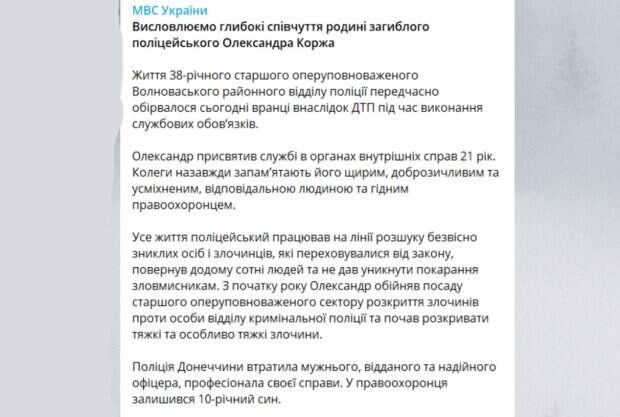 Полицейский раскрывал тяжкие и особо тяжкие преступления Полицейский Александр Корж попал в аварию во время выполнения служебных обязанностей и погиб. Он работал старшим оперуполномоченным Волновахского районного отдела полиции в Донецкой области. Об этом сообщается на Телеграм-канале МВС України. Как стало известно, утром 15 июля во время конвоирования преступника произошло дорожно-транспортное происшествие, в результате которого погиб 38-летний майор полиции Александр Корж.