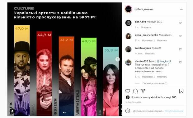 Первое место занял Дима Монатик с более чем 47 миллионами прослушиваний. Таким образом, певец "уделал" своих коллег Святослава Вакарчука, Тину Кароль, Настю Каменских и других. Публикация собрала сотни лайков и много комментариев. "Фантина исправят эту ситуацию после увиденного за пару дней