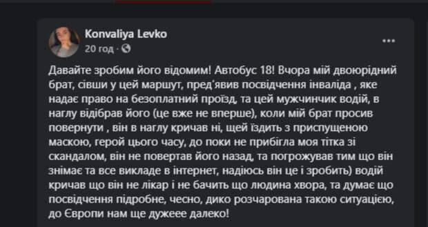 Маршрутчик выгнал с салона человека с инвалидностью Как передает Politeka.net, о произошедшем инциденте во Львове рассказала сестра пострадавшего в Facebook. "Вчера мой двоюродный брат, сев в этот маршут, предъявил удостоверение инвалида, дающее право на бесплатный проезд", - поделилась девушка. Более того, по ее словам, водитель отобрал у мужчины удостоверение.