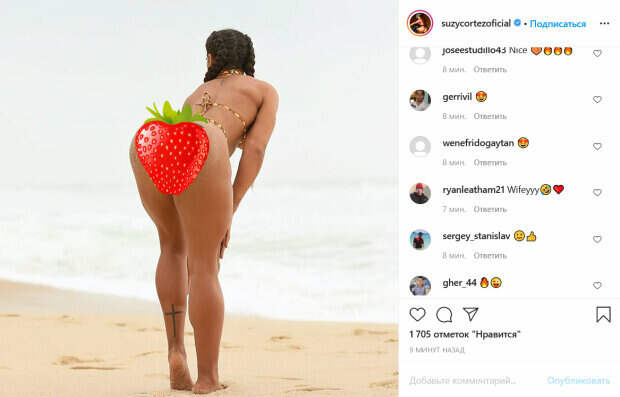 Девушка для социальных сетей добавила черную полоску, чтобы не попасть под цензуру. Об этом пишет Politeka.net со ссылкой на страничку знаменитости. "Доброй ночи", - подписала кадр звезда в Инстаграм. Фанаты поставили более 5 тысяч лайков и написали комментарии: "Барби Сьюзи Кортес", Ммм, как очень богатая перед фанатами", "Чудненько выглядишь на фото!!", "Потому что она исчезла из Facebook красивой спиной", "Сестра для Бога", "Спокойной ночи красивая", "Обанкротиться ... и скоро", "спокойной ночи малыш от твоего друга Герардо, мне нравится твое фото, да, любовь". Сообщалось, что популярная модель Сьюзи Кортез кокетливо наклонилась в купальнике-бикини. На фото Кортез позирует на берегу моря в открытом купальнике-бикини. Она стоит к зрителям спиной, поэтому разглядеть можно только его завязочки. Для более удачного ракурса Сьюзи кокетливо наклонилась вперед, оттопырив назад свою главную гордость. Напомним, хозяйка самых красивых ягодиц раззадорила видом в прозрачных трусиках А еще Politeka писала, что хозяйка самых красивых ягодиц устроила встряску ради "титула" в эффектном мини Также Politeka сообщала, что хозяйка самых красивых ягодиц показала свою гордость до неприличия близко