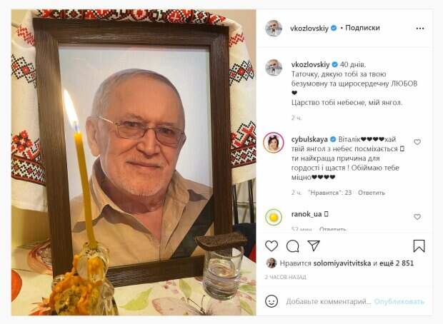 "40 дней. Папочка, спасибо тебе за твою безусловную и душевную ЛЮБОВЬ ❤️ Царство тебе небесное, мой ангел", - написал Козловский, подкрепив снимком где запечатлен его папа рядом со свечей. За два часа пост собрал почти 3000 лайков и много комментариев. "Виталик❤️❤️❤️❤️ пусть твой ангел с небес улыбается