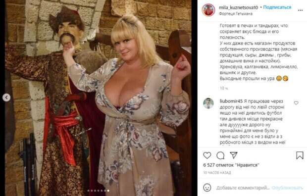 Украинская модель Мила Кузнецова, являющаяся обладательницей 15-го размера бюста, восхитила сочными кадрами Как передает Politeka.net, красотка опубликовала серию свежих фото в своем микроблоге в Инстаграм, на которых покуражилась перед камерой в удивительном месте. Так, модель похвасталась отдыхом в колоритном гостинично-ресторанном комплексе под Киевом.