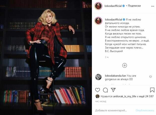 Артистка подчеркнула тонкую талию толстым пояском. Также певица надела прозрачную рубашку, под которой показался клетчатый топик, а сверху она надела такой расцветки рубашку. Образ обворожительной красотки дополнили различные украшения, а на ножках просто идеально смотрелись туфли на длинных шпильках. Пышная укладка с непослушными прядями у лица, и длинные черные стрелки на веках - Светлана просто неописуемо прекрасна. " Я не люблю фатального исхода. От жизни никогда не устаю. Я не люблю любое время года, Когда веселых песен не пою. Я не люблю открытого цинизма, В восторженность не верю , и ещё, Когда чужой мои читает письма, Заглядывая мне через плечо... В.С. Высоцкий", - подписала снимок красотка. За час пост собрал более 20 тысяч лайков и много комментариев: "Требуем ещё больше фото с этой прекрасной фотосессии