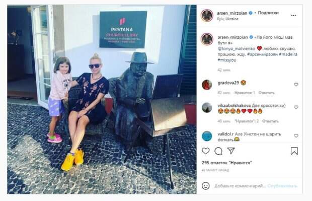 У певицы есть есть дочь Уляна от первых отношений, а в 2016 году исполнительница родила вторую дочь от Арсена Мирзояна, которую назвала Ниной. Пара жила в гражданском браке, а через год решила узаконить отношения. Сейчас Тоня отправилась с младшей дочерью отдыхать на Мадейру, остров в 500 км западного побережья Африки. Арсен у себя на страничке в Инстаграм решил показать снимок супруги и дочери. Звезда сидела в платье, а образ дополнила яркими кроссовками. Рядом стояла дочь в шортиках и толстовке. Мама с малышкой были у памятника Черчиллю. "На его месте должен быть я. Тоня, люблю, скучаю, работаю, жду", - написал Мирзоян. Фанаты поставили более 200 лайков и написали комментарии: "Две красотки", "Но Уинстон не шарит фоткать". Напомним, муж Тони Матвиенко Мирзоян попал впросак на "Співають всі" из-за песни Каменских Также Politeka сообщала, что муж Тони Матвиенко Мирзоян занялся готовкой морского "чудища", фото А еще Politeka писала, что жена Мирзояна Тоня Матвиенко в эффектном мини выставила напоказ ножки