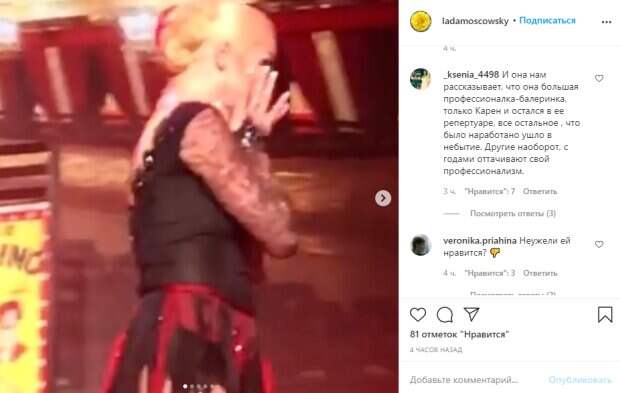 Чтобы оправдаться за более чем тысячи разгневанных комментариев, она скрыла доступ к посту. Также Волочкова написала о том, что она якобы прославленная и знаменитая звезда вей России, а ей просто завидуют, ведь она также может исполнить партию «Кармен», как никто другой. На анти-фанатских группах сразу же появились опровержения с фото Волочковой во время выступления с тем самым номером. Реакция также не заставила себя ждать: «твой Карен не Кармен