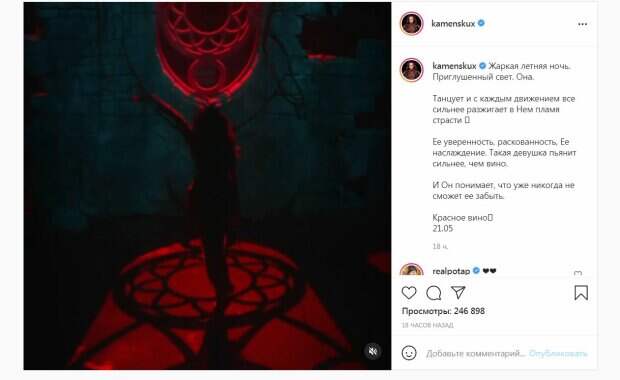 (Чтобы посмотреть видео, доскролльте до конца страницы) В таком образе Каменских позировала в новом клипе, премьера которого состоится 21 мая. Примечательно, что видео сделано в красных тонах, ведь песня называется "Красное вино". "Жаркая летняя ночь. Приглушенный свет. Она. Танцует и с каждым движением все сильнее разжигает в Нем пламя страсти