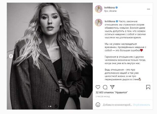 Боимся даже мысль допустить о том, что можем остаться наедине с собой и своими мыслями на длительное время. Мы не умеем наслаждаться временем, проведенным наедине с собой — это большая ошибка Гармония в отношениях с другим человеком возможна только тогда, когда она уже есть внутри нас. Ведь отношения – это про дополнение нашей и так уже целостной жизни, а не про перекрывание дырок в стене Ваш человек найдёт вас сам, но все случится в нужный момент. Не живите ради поиска «того самого». Живите ради счастливого себя", - написала Даша. Фанаты поставили более 30 тысяч лайков и написали комментарии: "Ну вы же пошли на холостяк искать того самого?", "Меня так умиляют пары, которые не прожив вместе и пары лет, не пройдя никаких совместных сложных этапов становления семьи (рождение малыша, безденежье), едва успев пожениться начинают учить окружающих - как построить успешные отношения. Вы такие наивные, милые и потешные со своими советами и рекомендациями. Не нарадуюсь) Честно) Вот живут же люди! С удовольствием посмотрю на Вашу пару лет через... Семь", "Счастливые люди - они как магниты. Притягивают к себе только нужных людей". Напомним, Квиткова из "Холостяка", набрав 22 кг за беременность, показала, какой худой была раньше А еще Politeka писала, что Квиткова из "Холостяка" вспомнила, какой худой была до беременности Также Politeka сообщалла, что Квиткова показала огромный дом, который для нее строит "Холостяк" Добрынин