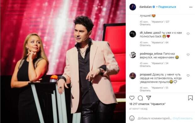 Зрителям нравилось наблюдать за его флиртом с Кароль во время предыдущих сезонов. Каково же было удивление публики, когда Дан снова возник на шоу, да еще и рядом с Тиной. Продюсер «Голосу країни» Владимир Завадюк объявил о перезагрузке нокаутов. Впервые за долгие годы принимать решение тренерам будут помагать другие звезды. В частности, Балан, как уже понятно, окажет поддержку Кароль. На опубликованном фото певец, одетый с оголочки, "хищно" облокотился о постамент с кнопкой. Тина рядом аж растаяла. "Дракула вернулся!", - подписал снимок Балан. Пользователи с энтузиазмом обсудили увиденное: "Только Дан умеет так неожиданно врываться! лучшие!!