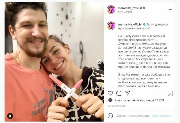 Запись звезда подкрепила личным фото, на котором она с мужем только узнали о таком событии. По словам MamaRika, они планировали детей, и старались забеременеть четыре месяца. "В какой-то момент я уже особо и не надеялась, что все случится в ближайшее время, поэтому даже не подозревала, что уже была в положении", - поделилась Кочетова. Хотя артистка заметила, что ее цикл сбился, но она связала это со сменой сезона, ведь осень всегда сложно переносится организмом. Но в один из дней Анастасия решила сделать тест. Увидев на нем одну полоску, она почему-то решила его не выбрасывать, а, вернувшись через полчаса, заметила вторую полоску. "Я впала в ступор. Прежде всего, я позвала Сергеича, и не веря своим глазам, в итоге заставила его съездить и купить мне еще четыре теста, чтобы наверняка, ахахаха