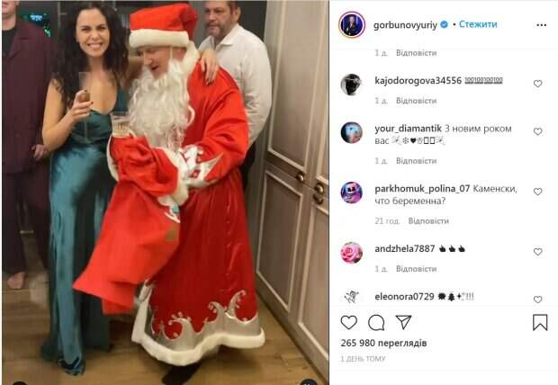 Также за кадром слышен голос супруги Горбунова – Кати Осадчей. «В отсутствие работы на Новый год Юрий Николаевич ходит по валютных хатах», - шутя говорит она. Горбунов нарядился в костюм деда Мороза. Каменских же надела в тонкое платье на бретельках модного в этом году глубокого сине-зеленого цвета. Струящаяся ткань подчеркнула формы артистки, в том числе и животик, заставив фанатов снова говорить о беременности певицы. "Каменских, что беременна?", "С Новым Годом Вас всех!", "Бомба", "Ребята,вы просто супер", "Молодцы ребята Вы самые лучшие", "Эх, нам бы такого Деда Мороза!!" - пишут в комментариях. Отметим, ранее сама Каменских признавалась, что уже готова стать мамой. Будучи ведущей шоу «Рассмеши комика. Дети», она рассказывала, что чувствует себя комфортно рядом с детьми, ведь они заряжают позитивной энергией. «В перерывах дети ждут фотографию, смотрят своими глазками, обнимают, дергают за волосы – и мне это все очень приятно. Может, я уже в том возрасте, когда очень надо детей и хочется, поэтому я так к этому всему отношусь», — говорила Каменских. Напомним, что кокетливая Каменских обескуражила новогодним образом в крошечном платье: "А животик то видно". Как сообщала Politeka, Каменских эффектно сбросила пижаму, впечатлив фигурой в атласной комбинации: "Красивенная женщина". Также Politeka писала, что горячая Каменских неожиданно сменила образ и удивила всех скромностью: "Очень красиво и мило...".