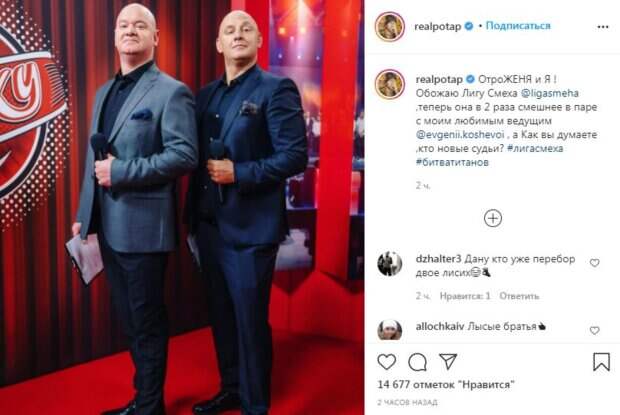 "ОтроЖЕНЯ и Я! Обожаю Лигу Смеха,теперь она в 2 раза смешнее в паре с моим любимым ведущим Евгением Кошевым, а Как вы думаете ,кто новые судьи?", - поинтересовался Потар у своих поклонников. Фанаты мгновенно отреагировали на публикацию и оставили под ней тысячи лайков. "Лысые братья", "Уже перебор, двое лысых", "Красавчики", "Мы уже знаем", "Прямо братья", "Двое из ларца", "Обожаю Лигу Смеха и всех вас", "Ну прям братья", "Бабкин, Баклан, и ещё тётенька", "Вам очень хорошо в костюмах. Стильно, солидно", - написали поклонники в комментариях под фотографией. Ранее мы рассказывали, что Потар решил учить жизни украинцев. Потап призвал поклонников тратить свое драгоценное время исключительно на решение своих проблем. А публикацию Потап дополнил фотографией с видом на заснеженный Киев. Публикация понравилась поклонникам и они завалили мужа Насти Каменских и поблагодарили его за мотивирующий пост. На сайте Politeka мы писали, что Потап ударился в философию и озадачил обращением Портал Politeka информировал, что Потап подогрел слухи о романе Позитива и Андраде, провокационное фото Ранее портал Politeka сообщал, Суровый Кошевой из «Квартал 95» удивил сходством с Потапом