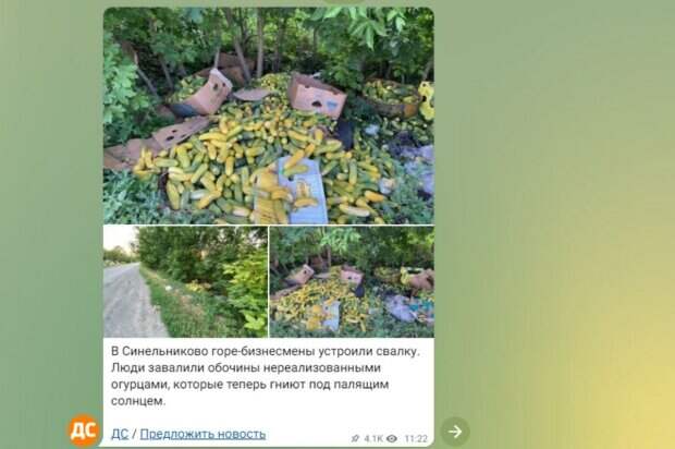 Под Днепром предприниматели выбросили овощи, которые не смогли реализировать Как передает Politeka.net, кадры с места опубликовали в Telegram-канале "Днепр сейчас". "В Синельниково горе-бизнесмены устроили свалку. Люди завалили обочины нереализованными огурцами, которые теперь гниют под палящим солнцем", - говорится в сообщении.