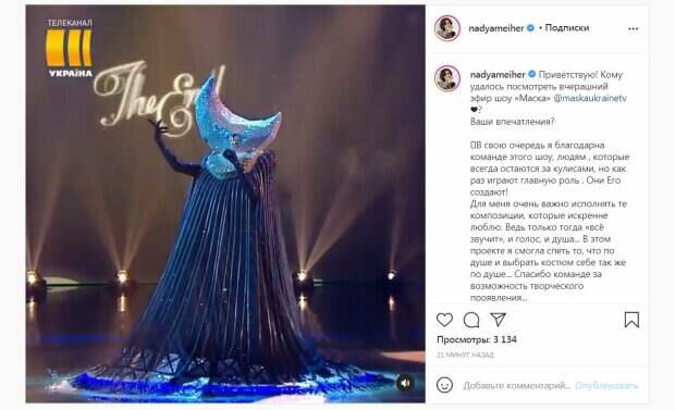 Последний практически сразу назвал имя исполнительницы. В своем посте в Инстаграм Надежда рассказала об участии в популярном шоу. "Я благодарна команде этого шоу, людям, которые всегда остаются за кулисами, но как раз играют главную роль. Они Его создают!", - написала артистка. По словам Надежды, для нее важно исполнять песни, которые она любит, ведь именно тогда "звучат" голос и душа. "В этом проекте я смогла спеть то, что по душе и выбрать костюм себе так же по душе... Спасибо команде за возможность творческого проявления...", - написала певица. Также артистка в конце добавила, что ее голос изменили, ведь ее настоящий - более глубокий тембрально. Это было сделано для максимальной неузнаваемости. За 20 минут публикация собрала более 3000 просмотров и много комментариев: "Молодчинка!!!", "Класс!!!", "Нет слов, было просто офигенно
