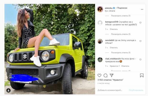 Об этом пишет Politeka.net со ссылкой на страничку знаменитости. "Автомобиль хорошего настроения", - написала Лобода. Фанаты поставили почти 4 тысячи лайков и написали комментарии: "О, класс, это крутая машина", "Красотка Сашка", "Непревзойденная", "Хорошие ножки", "Ты крутая, Сашка", "На этом фото прекрасно все", "Машина огонь, как и владелица", "На футбольном стадионе - получше", "Неплохой выбор", "Капот аж стал горячим", "Смотри, кто залез на твой автомобиль, еще и багажник заняли", "Это именно на нем гоняли по Карпатам". Сообщалось,. что известная украинская телеведущая Александра Лобода показала себя и рассказала об эфире. Красотка в этот раз была в платье в горошек с белой корсетной частью. В наряде оказалось огромное декольте, которое сделало образ довольно соблазнительным. Александра оставила волосы распущенными, а сама улыбалась на камеру. Напомним, жена нападающего "Динамо" в бикини на веревочках изумила ракурсом, муж в восторге А еще Politeka писала, что жена легенды "Динамо" Гусева с подружкой избавились от белья, поиграв перед камерой Также Politeka сообщала, что неотразимая жена Гусева задрала экстра-мини, заставив мужчин краснеть