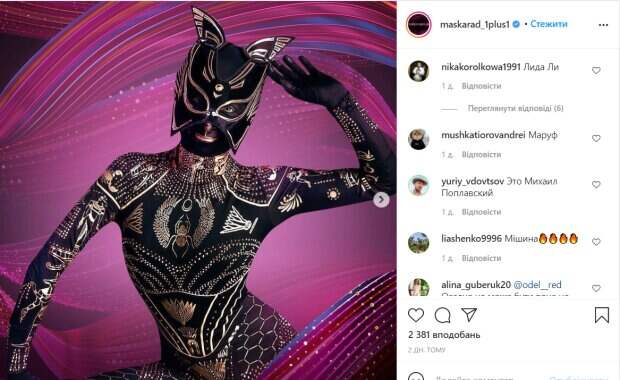 Напомним, что в описаниях к постам организаторы "Маскарада" всегда дают определенные подсказки, кто же может прятаться под тем или иным костюмом. Так, на этот раз новой героиней шоу стала обольстительная Кошка. "В моей жизни было много соревнований и конкурсов, но на этот раз я покажу свою грацию, пластичность и настоящую с***ности. Моей главной мечтой было иметь много детей. Я долго искала настоящую любовь, и даже несколько раз была замужем. В конце концов мне повезло: я нашла того самого мистера-кота. Сейчас я очень счастливая жена и мама нескольких деток", - рассказывает о себе Кошка. На телеэкранах Кошка появится в черном обтягивающем костюме, усыпанном тысячей золотых страз и с элементами египетской символики. Голову сказочной особы украшают игривые ушки с золотым декором. Поклонники шоу сразу увидели догадываться, кто же может прятаться в образе кошки. "Мишина