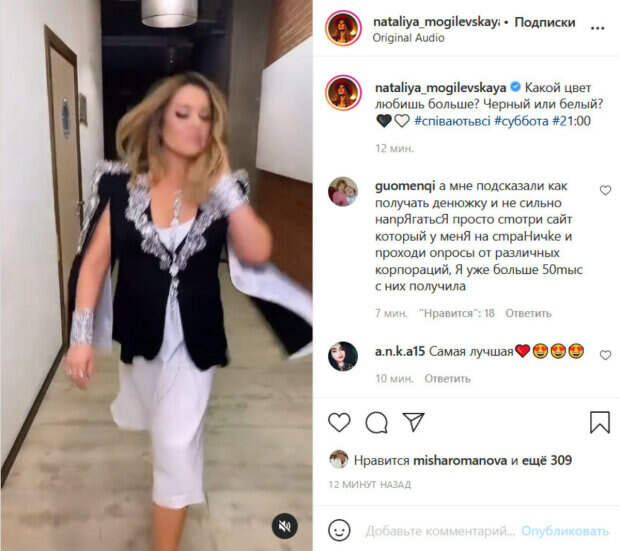 Речь идет о белом платье-комбинации из струящейся шелковистой ткани и необычной черной накидки сверху. Главной изюминкой этого образа стали многочисленные сверкающие украшения. Так, накидка певицы обильно вышита крупными стразами, которые эффектно переливаются при ходьбе. Могилевская также демонстрирует крупным планом блестящие браслеты и кольца. На кадрах певица эффектно шагает по коридору, демонстрируя свой наряд во всей его красоте. «Какой цвет любишь больше? Черный или белый?», - подписала кадры Могилевская. Ее поклонники тут же принялись комментировать пост. «Самая лучшая», «Очень необычный и красивый костюм!», «Красивый стильный костюм. Кто Ваш модельер очень интересно? Когда будут прямые эфиры с закулисья. Тренировочек?», «Богиня наша», «Вауууу. Вы красотка», - пишут люди. Напомним, участниц шоу "Співають всі" довели до слез, что произошло. Как сообщала Politeka, драма разыгралась на шоу "Співають всі", Могилевская не сдержала слез. Также Politeka писала, что Могилевская после похудения сорвалась с диеты, огорошив кадрами.