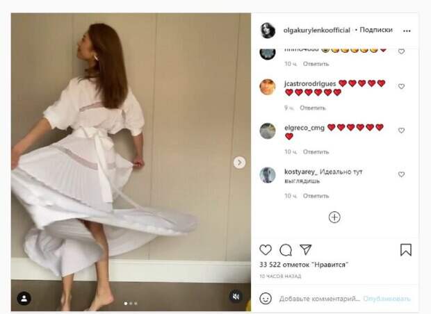 Известная актриса Ольга Куриленко, которая сыграла роль девушки Джеймса Бонда, показала себя в интересном наряде На кадрах Ольга позировала в белом платье с поясом и небольшом декольте. Девушка была без обуви, закружившись у стены, чтобы поднять нижнюю часть наряда. Платье настолько поднялось, что можно практически увидеть верхнюю часть ножек.