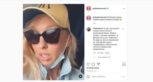 В защиту дочери певица выставила видео-обращение, в котором "вцепилась" в комментаторов: " «Конечно понимаю, что многих очень сильно возмутили маты. Не могу сказать, что я поддерживаю маты в песнях, но если бы вы послушали когда-нибудь, поинтересовались музыкой, которую слушают ваши дети, то вы бы очень удивились. Потому что то, что делает Маша – это просто сказочки для деток по сравнению с тем, что сегодня слушает молодежь», - сказала артистка. На этот раз 37-летняя артистка Ольга Полякова поделилась новым видео в Инстаграм. На кадрах - выступление дочери Маши. Она стоит на сцене со своей группой "Швы" и исполняет песню, в которой присутствует мат. Ольга прыгает и танцует под музыку и поддерживает свою дочь. "Маша первый раз выступает со своей группой Швы. Маруся! Ты крутая! Взорвала, порвала, подняла всех, а это очень сложно с незнакомыми песнями! Ты такая трушная, зажигалка, бунтарка! Ты энергичнее, голосистее и открытие меня, в твоём возрасте (мне пришлось много лет потратить на то, чтобы принять себя и открыться), а ты сразу такая, как нерв, творческая, пишешь музыку, слова, именно таких артистов сегодня время! Не слушай никого, иди вперёд, с опытом придёт мастерство!!! А пока учись и не останавливайся моя птичка! Горжусь тобой, моя любовь, моя жизнь, мой первый блин ))) и не комом!", поддержала свою дочь артистка. Под этой публикацией продолжились осуждения выступления и критика Ольги как матери: "Мама Оля, поверьте, мы так же родители. И так же знаем что слушают наши дети. Если нам не зашли слова песен Марии, это не говорит о том что мы с Луны упали, тут напрашивается мысль "Не протест ли Вам, родители Маши, не к Вам ли обращены слова?", "Какой кошмар! Что песня,что исполнение,что голос! Не в обиду Оле" Politeka рассказывала, ЧП случилось с Поляковой и ее дочерью в аэропорту, певица рвет и мечет: "А собирались поужинать…" Также, Полякова резко высказала украинцам, что о них думает после волны негатива в адрес дочери: "Она еще покажет вам" Ранее сообщалось, Полякова надела меленький купальник и впечатлила объемными формами на курорте: "Ну что?"