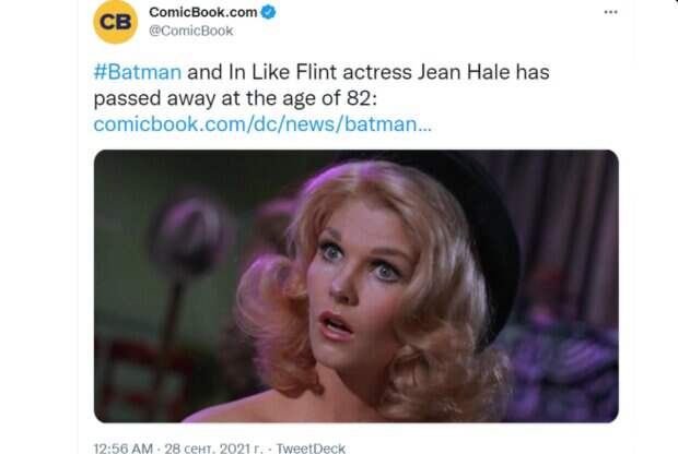 Актриса скончалась еще в августе, но известно о ее кончине стало только сейчас Скончалась американская актриса и сценаристка Джин Хейл на 83-м году жизни в Санта-Монике. Об этом сообщает портал Deadline со ссылкой на семью покойной. Ее близкие сообщили, что причины смерти были естественными — она не страдала и умерла от старости.