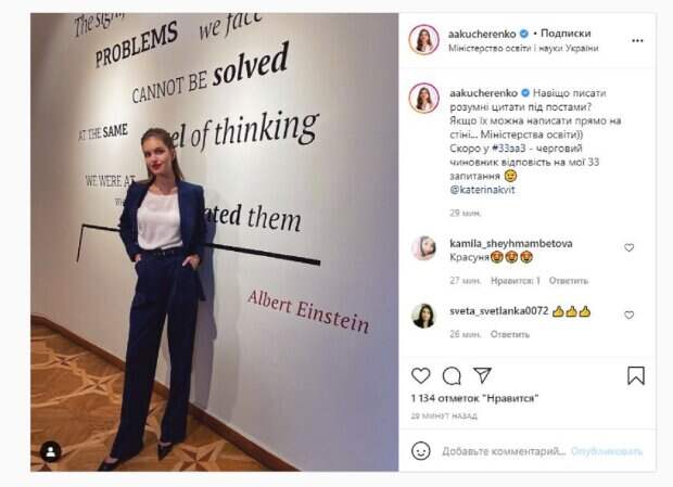 Об этом пишет Politeka.net со ссылкой на страничку знаменитости. "Мы не можем решать наши проблемы на том же уровне мышления, который их создал", - была написана легендарная фраза физика. "Зачем писать умные цитаты под постами? Если их можно написать прямо на стене... Министерства образования. Скоро в "33 за 3" - очередной чиновник ответит на мои 33 вопроса. Фанаты поставили более тысячи лайков и написали комментарии: "Красотка", "топ", "Цитату не видно", "Только удивительно, почему цитаты на английском языке", "Вы выглядите очень профессионально и уважаемо". Мы писали, что известная украинская ведущая и жена шоумена Дмитрия Комарова Александра Кучеренко показала подборку своих самых элегантных образов в платьях. На фото Кучеренко позирует в женственных платьях-футлярах, которые идеально подчеркивают ее точеную фигурку. Среди нарядов два платья соблазнительного красного цвета, нежно-голубой наряд с трогательной лентой на шее, белое платье с оригинальным корсетом и глубоким декольте, а также черное платье с соблазнительными полупрозрачными вставками на животе и руках. Напомним, Санина из "Танців з зірками" и жена Комарова преподали стильный урок украинкам А еще Politeka писала, что жена Комарова из "Мир наизнанку" в костюме показала фигуру в полный рост Также Politeka сообщала, что жена Комарова из "Мира наизнанку" показала мастерство переодевания