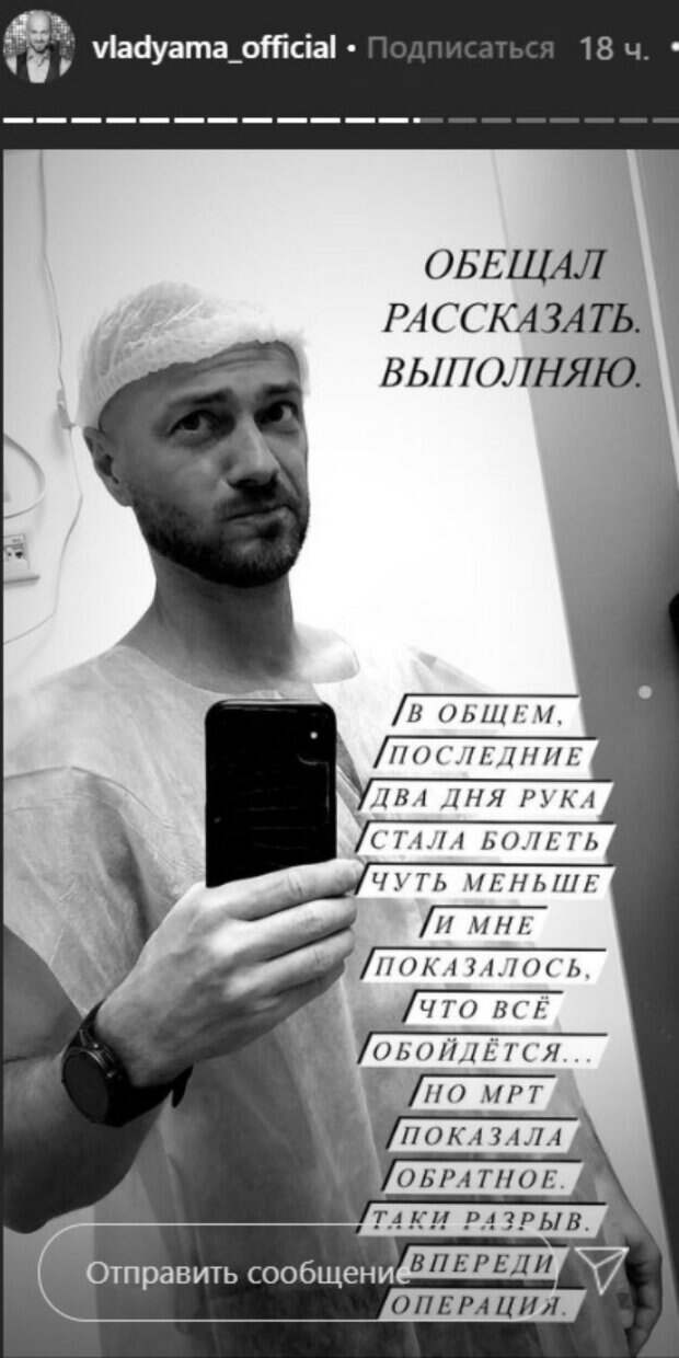 Хоть Влад и судья, но ему также порой приходится выходить на паркет. Так, в четвертьфинале он повредил левую руку во время сложнейшей стойки, исполняя номер с участницей проекта певицей Юлией Саниной. Яму срочно госпитализировали прям с эфира. К счастью, перелома не было, но зато был разрыв связок. Позднее Яма делился у себя в Инстаграм кадрами из больницы, где рассказывал, что операции не избежать. "Мне показалось, что все обойдется, но МРТ показала обратное... таки разрыв. Впереди операция. Но все будет хорошо, еще потанцуем!", - делился хореограф. Судя по последнему фото, сейчас Яма уже в хорошей форме, но еще вынужден быть осторожным и носить бандаж, занимаясь в спортзале. "Заехал сфоткаться