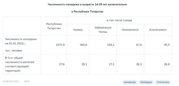 молодых людей, в Набережных Челнах - 144,2 тысяч, в Нижнекамске - 67,9 тысяч, в Альметьевске — 45,5 тысяч. скриншот/tatstat.gks.ru В декабре прошлого года президент России Владимир Путин подписал закон, закрепляющий возраст молодежи до 35 лет включительно. Ранее под эту категорию попади граждане в возрасте от 14 до 30 лет.