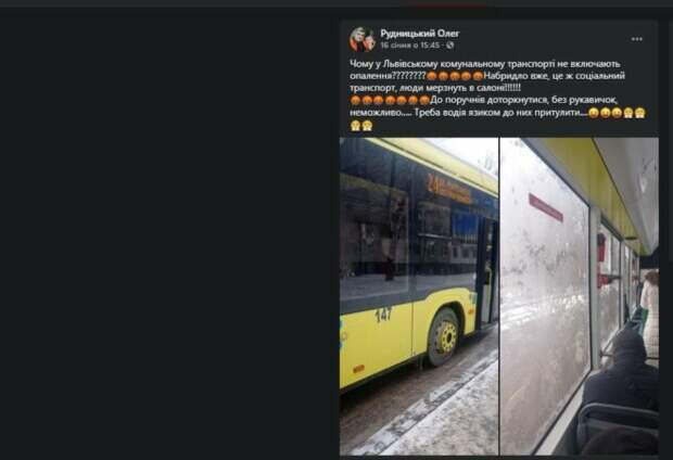 Жители Львова жалуются на отсутствие отопления в общественном транспорте Как передает Politeka.net, бурные обсуждения начались после поста львовянина в сети. "Почему во Львовском коммунальном транспорте не включают отопление? Надоело уже, это же социальный транспорт, люди мерзнут в салоне! К поручням прикоснуться, без перчаток, невозможно.