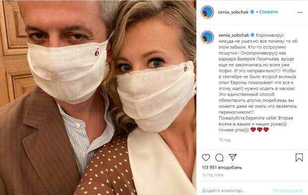 net. На обоих – защитные маски. При этом Ксения позаботилась о «карантинном» макияже, подчеркнув косметикой выразительность глаз. В подписи к фотографии Собчак написала россиянам о скрытой опасности и цене их легкомыслия. «Коронавирус никуда не ушел, но все почему-то об этом забыли. Кто-то остроумно пошутил: он (коронавирус) – как карьера Валерия Леонтьева, вроде, еще не закончилась, но всем уже пофиг. И это неправильно!!!! Чтобы в сентябре не было второй волны (а опыт Европы показывает, что все к этому идет), нужно ходить в масках! Это – единственный способ обезопасить других людей, ведь вы можете даже не знать, что являетесь переносчиком!!! Пожалуйста, берегите себя! Вторая волна - в ваших и наших руках))) точнее-ртах))) ❤️❤️❤️», – говорится в тексте. Однако сравнение вируса с карьерой легендарного певца не всем пришлось по душе. «Вам так обоим лучше 😂», «Как смешно, фотку в маске сделали и сразу же сняли)))», «А Леонтьева зачем обижать?🤦♀️», «Леонтьев то что сделал плохого, даже фигурально 🐎», «Вот эта тряпочка на Вашем лице фикция», «Интересно, сколько стоит такого рода посты. 🤣🤣», «Как можно персонализировать свои "шутки". Коронавирус – как карьера Собчак, вроде никак не развивается, но на Богомолова уже смотрит, как на запасной "кошелечек")», «Вам до Леонтьева, как до Луны)», – пишут пользователи. Напомним, счастливый Богомолов не сдержался и показал Ксению Собчак в неожиданном виде: "Беременна!" Как сообщала Politeka, Собчак резко изменила внешность и поиздевалась над женщинами: "Уже со всеми переругалась". Также Politeka писала, что мокрая Собчак развлеклась с двумя ковбоями, Богомолов будет взбешен: "Оторва".