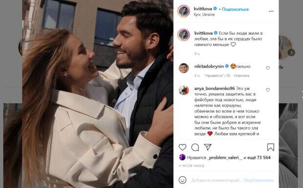 Об этом пишет Politeka.net. Так, Даша решила порассуждать на тему любви. «Если бы люди жили в любви, зла бы в их сердцах было намного меньше», - написала красотка. В качестве иллюстрации она опубликовала их совместное с Добрыниным фото. На кадре, сделанном на улице, Квиткова трогательно обнимается с любимым, прижимаясь к нему. При этом, они оба счастливо улыбаются и выглядят по-настоящему влюбленными. Пост жены впечатлил бывшего «холостяка». «Сильно», - написал Добрынин в комментариях. Подписчики Даши тоже принялись комментировать ее публикацию. «Такие милые», «Прекрасная пара», «Это правда, любовь она вдохновляет, делает нас светлее и лучше», «Какая искренняя фотография, согласна прям в точку», «Красивые-то какие», «Какие вы солнечные», «Очень хорошее фото и правильные слова», «Это точно. Какая вы прекрасная пара!», «Светлячки», «Умные слова умной женщины», «Вы такие искренние, открытые», «Счастья Вам желаю ! Самая крутая парочка», - пишут люди. Напомним, "холостяк" Добрынин в приливе нежности впервые показал еще нерожденного сына: "Это уже слишком...". Как сообщала Politeka, "холостяк" Добрынин позаигрывал с поклонницами на улице, Квиткова не сдержалась: "Горячий муж у меня". Также Politeka писала, что беременная жена "Холостяка" Добрынина призналась в серьезных проблемах со здоровьем: "Чтобы окружающие не догадались...".