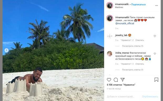 На новых снимках можно увидеть, чем семейство занимается на отдыхе. Монатик с сыновьями решили разнообразить свое времяпровождение на пляже и занялись строительством замков на песке. На фото можно увидеть, что они создали целую серию разнообразных конструкций. Ирина также запечатлела как певец радостно поднимает на руках одного из сыновей. Еще на одном фото Монатик в плавках беспечно лежит на песке. Судя по этому снимку, певец изрядно загорел за время отдыха. «Папа строит сыновьям замки...на песке», - подписала фото Ирина. Украинцы бурно отреагировали на такие яркие семейные снимки. «Фантастически красивый кадр и пейзаж, замки из белоснежного песка», «Папе 12+ класс», «Нереально просто в архитекторы тоже можно смело идти», «Загар шикарный», «Очень, очень, красиво. Талантливый человек-талантливый во всём», «Такой счастливый и загоревший Дима», «Чудесная семья», «Он у Вас и архитектор прекрасный», «Загар красивый! А замки просто супер, деткам повезло с таким папой», - пишут люди. Напомним, фигуристая жена Монатика в купальнике с вырезом показала все свое великолепие: "Бегущая по волнам...". Как сообщала Politeka, жена Монатика в броском купальнике получила райское наслаждение прямо в воде: «Жизнь прекрасна! ». Также Politeka писала, что счастливый Монатик в одних трусах показал райское наслаждение посреди джунглей: "Сеньор Робинзон и его...".