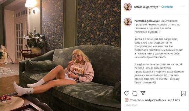 Приемная дочь украинского продюсера и рэпера Потапа Наталья Горовая похвасталась стройной фигурой Как сообщает Politeka.net, новое фото 22-летняя девушка опубликовала у себя на странице в Instagram, и рассказала, как ей удается поддерживать себя в отличной форме. Наташа Горовая запечатлена сидя на диване с бокалом вина.