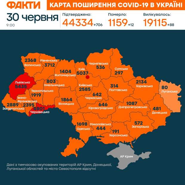 Всего в Украине 44 334 случаи Covid-19. Завремя пандемии умерли 1 159 человек, 12 — за последние сутки. Среди лидеров антирейтинга — Львовская, Черновицкая область и столица. Читайте: Коронавирус в Украине — карта распространения Covid-19 Коронавирус в Киеве 30 июня в столице 57 жителей заболели, среди них шесть медиков. Сейчас здесь 5037 подтвержденных случаев Covid-19. В больницах 14 людей, остальные на самоизоляции дома. Среди заболевших 8-летний мальчик. Карантин в Украине Из-за массовых гуляний на День Конституции, в Одессе и других южных городах, возможен новый всплеск коронавируса. Пляжные клубы и рестораны там не соблюдали карантин, говорят в Минздраве. О второй волне Covid-19 также заявил президент Владимир Зеленский. Он обеспокоен динамикой распространения инфекции в некоторых областях. Украина присоединится к Стратегии ЕС в сфере вакцинации против коронавируса, заявила вице-премьер-министр по вопросам европейской и евроатлантической интеграции Украины Ольга Стефанишина. В то же время почти 50% украинцев не хотят делать вакцинацию от Covid-19. Карантин в ООС 29 жителей оккупированного Донбасса отправили на принудительную обсервацию. Они попытались пересечь линию разграничения без мобильного приложения Дия. Дома. Теперь они пробудут 14 дней в медучреждении под наблюдением медиков. Приложение должен устанавливать люди, которые вернулись с оккупированных территорий или стран, входящих в ”красную зону” МИДа. Оно отслеживает в режиме реального времени, где находится человек.
