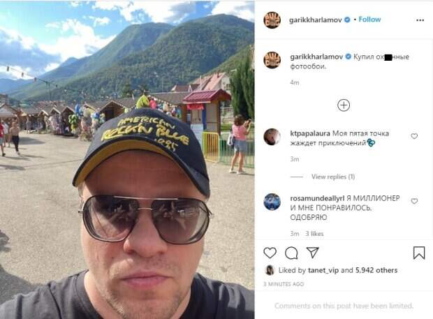 Туристический образ довершила бейсболка и черная футболка. Гарик Харламов сделал селфи на фоне зеленых гор и красивого неба. Видно также торговые палатки с сувенирами и гуляющих людей. Судя по надписи, юморист устроил себе отдых на российском курорте. В описании он пошутил, что никуда не уехал, а просто купил себе крутые фотообои. Пользователи социальной сети выразили свое мнение в комментариях: "Гарикус Харламус в путешествиях новый комедйиный блокбастер этим летом"; "Даже тень есть. Очень реалистично"; "ты на отдыхе, нас не проведешь