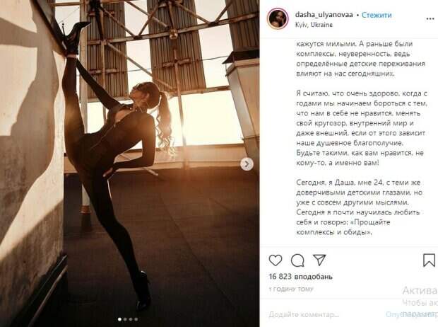 Будьте такими, как вам нравится, не кому-то, а именно вам!» — говорится в сообщении. Сама же Ульянова утверждает, что несмотря на свой возраст, осталась такой же, как и была. «Сегодня, я Даша, мне 24, с теми же доверчивыми детскими глазами, но уже с совсем другими мыслями. Сегодня я почти научилась любить себя и говорю: «Прощайте комплексы и обиды», — подчеркивается в тексте сообщения. Уточним, что на опубликованном снимке Ульянова позирует в латексном наряде, эффектно расстегнув его и застыв в идеальном шпагате. «Хороша, чертовка», «Даша, ты просто пушка», «невероятный вид», «какой шпагат! Завидую», «это просто что-то невероятное. Ты удивляешь меня с каждым своим новым снимком», — пишут ее поклонники. Напомним, Даша из "Холостяка" пустилась во все тяжкие после измены Макса Михайлюка: "Вторая Волочкова" А еще Politeka писала, что в жизни пары из "Холостяка" случилось непредвиденное, Даша ошарашила деталями: "Макс признался, что..." Также Politeka сообщала, победительница "Холостяка" Даша Ульянова без белья ошеломила дерзкой выходкой: "Будущая звезда".