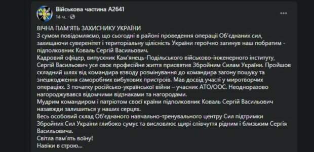 Одним из них оказался подполковник Коваль Сергей, который был в АТО с 2014 года. "Сергей Васильевич всю свою профессиональную жизнь посвятил Вооруженным Силам Украины. Прошел сложный путь от командира взвода разминирования к командиру отряда поиска и обезвреживания самодельных взрывных устройств", - говорится в сообщении. За плечами опытного командира множество миротворческих операций и наград. "Весь личный состав Объединенного учебно-тренировочного центра Сил поддержки Вооруженных Сил Украины глубоко скорбит и выражает искренние соболезнования родным и близким Сергея Васильевича. Светлая память воину", - сказано в сообщении. Украинцы также выразили соболезнования родным и близким героя. "Кто вернет маме ребенка, кто будет отвечать?, Какое горе, боль, боль, каждой маме выдержки, пережить это, мне очень больно, очень, Царство Небесное Герою", "Вечная память ... Царство Небесное ... искренние соболезнования родным и близким", "Сердце разрывается от боли", - писали в комментариях под постом. Напомним, что Украина понесла невосполнимые потери на Донбассе: в ВСУ сообщил горестную весть. Как сообщала Politeka, Украина оплакивает 30-летнего бойца ВСУ, фото и трагические подробности: "Пожертвовал своей жизнью. ..". Также Politeka писала, что враг атаковал украинского воина прямо на позиции ВСУ, кадры: "бросился на солдата и порезал...".