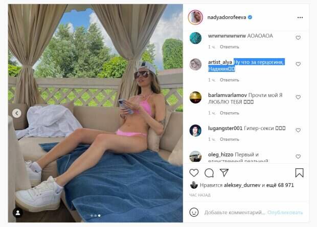 Завершили образ звезды разные летние аксессуары. Красотка позировала, держа в руках телефон. "Это я. Читаю ваши комменты под клипом «Почему»", - написала Надя. За час публикация собрала более 60 тысяч лайков и много комментариев. "Капец", "Купальник шикарный