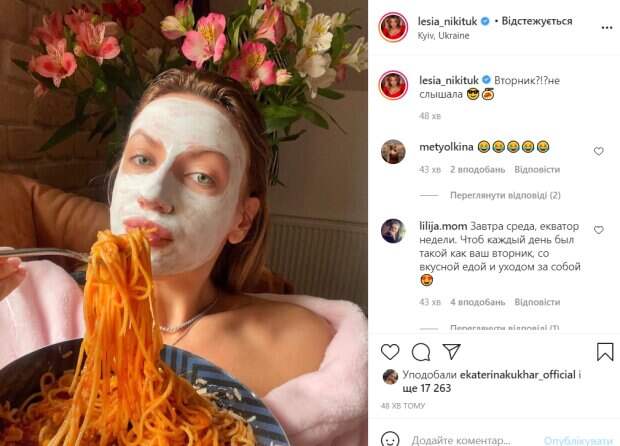 Во всяком случае, на некоторое время. В ее тарелке не огурцы и авокадо для правильного питания, а калорийные спагетти в красном соусе. Леся намотала их на вилку и пристально смотрит в камеру, позируя во всей красе. «Вторник?!?не слышала
