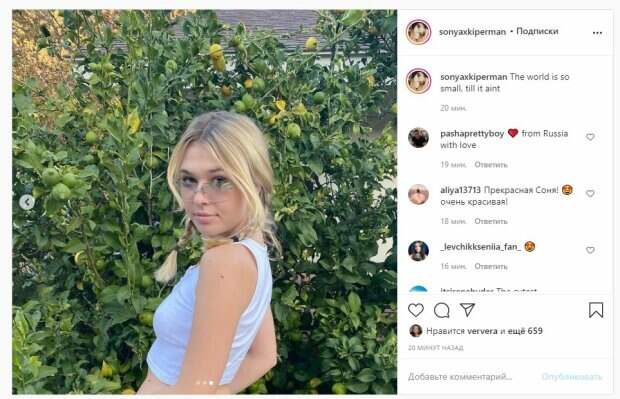 Дочь известной украинской певицы Веры Брежневой Соня Киперман показала себя и рассказала о мире На фото Соня показалась в светлом топе, который настолько обтянул упругий бюст, что он прямо выпирал из наряда. Образ Киперман дополнила стильными очками, которые можно увидеть на одном из кадров. Дочь Брежневой улыбалась и закрыла глаза от удовольствия.