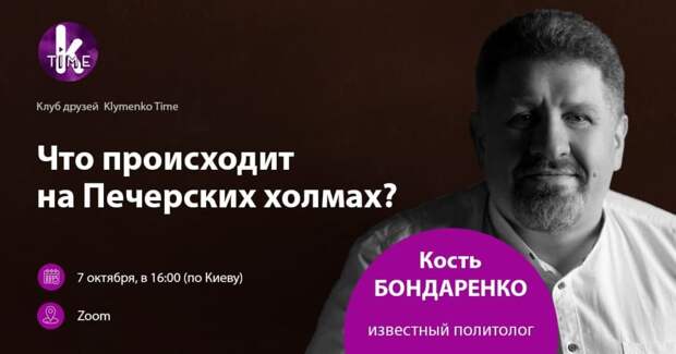Друзья, завтра новая встреча в Клубе друзей Klymenko Time! У нас в гостях – известнейший украинский политолог Константин Бондаренко. Тема: «Что происходит на Печерских холмах?» Когда: 7 октября, в 16:00 (по Киеву) Где: Zoom (ссылка на встречу) О чем будем говорить: — Офшорный скандал и президент Зеленский — Отставка спикера Разумкова — Сможет ли скандал с Укрэксимбанком стать антикризом для Офиса президента Готовим вопросы и ждем встречи!
