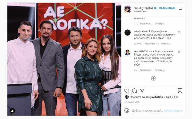 ".  Соответствующее фото Цымбалюк разместил в своем Инстаграме. В кадре актер предстал в компании таких звезд как: актрисы и "Холостячки" Ксении Мишиной и ее возлюбленного - комика Александра Эллерта, а также певицы Златы Огневич.  Украинские знаменитости улыбались, глядя в камеру. К слову, Тарас позировал  в сером костюме, Злата предстала в зеленом коротком платье, а Мишина - в черном корсете, рубашке и синих джинсах.  "«Где логіка ?» - новое шоу на @novy_channel! Вот такой состав будет в эфире 9го марта: мужчины или женщины, кто победит?)", - написал Цымбалюк.  За два часа пост собрал более 2000 лайков и много комментариев:  "Ксюшааа", " Ухтыыыыыы