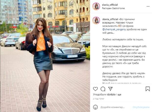 Так, недавно красотка показывала себя в вышиванке, а теперь выложила в сеть снимок, на котором появилась в весьма смелом образе. Как видно на фото, 37-летняя Слава запечатлена на прогулке в стильном образе. Перед камерой она появилась в короткой кожаной юбке черного цвета и яркой оранжевой блузке, поверх которой накинула темный пиджак. Длинные роскошные волосы певицы распущены, а на ее лице яркий макияж с красной помадой. В подписи к публикации Slavia написала о мотивации: "Все причины внутри. Наружу только возможности". Эта фраза сделала не один мой день... Люблю мотивировать себя и других. Моя мотивация: иногда напоминай себе, что ты «0», не воспринимая это буквально. Из любви к себе время от времени полезно обнуляться (всегда есть куда расти), и не стесняйся этого, потому что кому до твоего «0» еще надо дорасти". Пользователи тут же принялись обсуждать новое фото красотки, засыпая е комплиментами в комментариях к публикации: "Действительно вдохновляете, Славия", "Ух, красотка", "Какие ножки", "Слава, вы прекрасная", "Какая красивая", "Образ огнь". Напомним, Дзидзьо нашел, чем похвастаться на фоне развода со Slavia: "У меня их уже семь". Как сообщала Politeka, Разводящиеся Дзидзьо и Slavia публично обменялись "любезностями": Пономарев тоже решил не молчать. Также Politeka писала, Дзидзьо после скандала с разводом настигла новая беда: "От шкодник, посмотрите, что наделал".