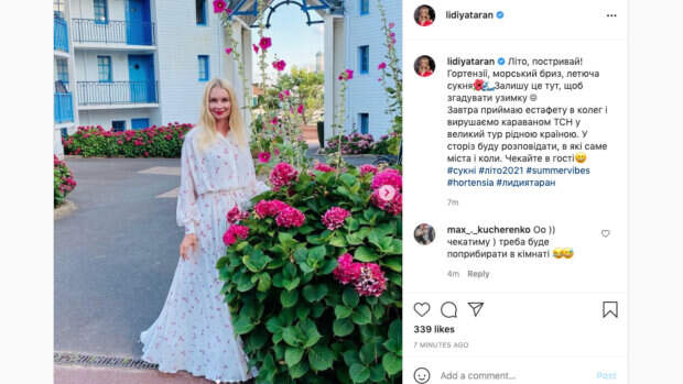 На снимках с отдыха Лидия в длинном полупрозрачном белом платье красуется в саду гортензий. "Лето, погоди! Гортензии, морской бриз, летающее платье. Оставлю это здесь, чтобы вспоминать зимой. Завтра принимаю эстафету у коллег и отправляемся караваном ТСН в большой тур по стране. В сториз буду рассказывать, в какие именно города и когда. Ждите в гости", заявила телеведущая. Поклонники засыпали Лидию комплиментами и оставили ей множество приятных комментариев: "Какая красота, и вы, и вокруг", "Второе фото невероятно волшебное! Где такая красота?", "Какая красивая", "Чудесная, волшебная, невероятная". Ранее сообщалось, звезда 1+1 Лидия Таран вспомнила об Украине на шикарном курорте: "Все же не родная земля..." Также, звезда "1+1" Таран сверкнула фигурой в купальнике, раскрыв секреты съемки на пляже: "Можешь втянуть живот..." Politeka рассказывала, Мосейчук, Таран и другие звезды "1+1" показали своих детей и поделились секретами материнства: редкие кадры