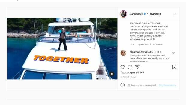В этот раз Барских с Бадоевым создали новый зажигательный клип, в котором артист танцует на яхте Певец распахнул рубашку и сверкнул накаченным прессом. (Чтобы посмотреть видео, доскролльте до конца страницы) Все это время Макс пел новую заводную композицию. "Делимся с Вами нашим настроением, лови волну, люби себя и помни каждый день уникален!", - написал Бадоев. Публикация собрала десятки тысяч просмотров и много комментариев: "Напоминает Элвиса Пресли