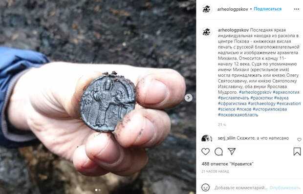 Княжескую печать, которая могла принадлежать внукам Ярослава Мудрого, нашли археологи в ходе раскопок в историческом центре Пскова, сообщает пресс-служба Археологического центра Псковской области 11 октября в социальной сети Instagram. «Последняя яркая индивидуальная находка из раскопа в центре Пскова — княжеская вислая печать с русской благопожелательной надписью и изображением архангела Михаила.