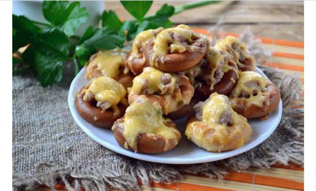 За это время из фарша, измельченной луковицы, яйца и сметаны делаем начинку, не забудь посолить, поперчить, можно добавить специи и зелень. Противень застилаем пергаментной бумагой и раскладываем сушки, чтобы они не соприкасались. В каждую выкладываем горку фарша и отправляем в разогретую до 180 градусов духовку на 15 минут. За это время натираем сыр. Противень извлекаем, посыпаем сушки сыром и отправляем обратно в духовку на 3-4 минуты, пока он расплавится. Готово! Можно кушать просто так, можно со сметаной или любым соусом.[caption id="attachment_69874" align="aligncenter" width="602"] Фаршированные бублики[/caption]