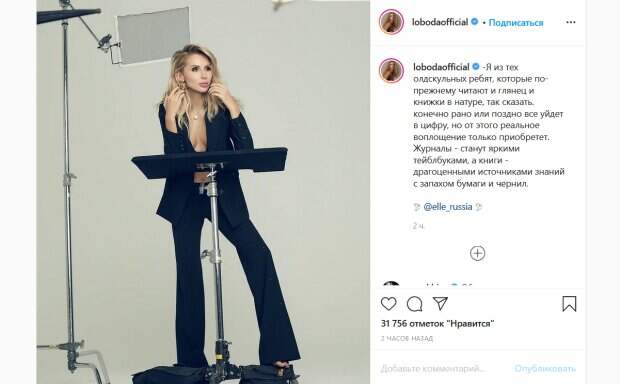 Для гламурного фотосета певице подобрали очень стильный образ. Звезда позирует в черном брючном костюме, под которым можно увидеть короткий топ с очень глубоким декольте. Такая вызывающая деталь не может не привлечь к себе внимание. В подписи к фото певица раскрыла свое отношение к печатным изданиями. «Я из тех олдскульных ребят, которые по-прежнему читают и глянец и книжки в натуре, так сказать. конечно рано или поздно все уйдет в цифру, но от этого реальное воплощение только приобретет. Журналы - станут яркими тейблбуками, а книги - драгоценными источниками знаний с запахом бумаги и чернил», - написала Лобода. Ее поклонники бурно отреагировали на пост звезды. «Костюм огонь», «Красавица», «Умница! Ты просто супер!», «Какая же Вы роскошная, Светлана Сергеевна», «Что ты делаешь Света? Что делаешь со мной», «Сногсшибательная», «Сразу видно, что есть чувство стиля», «Твои глаза сияют всегда», - пишут люди. Напомним, Лобода посветила бюстом в "подпрыгнувшем" бикини и запела от удовольствия: "Вот так и живем...". Как сообщала Politeka, Лобода в полупрозрачном наряде поразила образом, фанаты в восторге: "Светлана нас балует...". Также Politeka писала, что Светлана Лобода в опасно коротком платье из нитей разбередила томным видом: "Сколько наслаждений. ..".