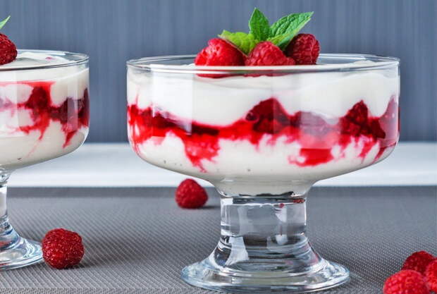 л.). Готовую творожную массу соединить с двумя столовыми ложками сметаны. Сметану смешать с одной столовой ложкой сахара. В подходящую десертную посуду выложить слой творожной массы, затем – малину с сахаром. Далее – сметану и сверху украсить ягодами. [embed][/embed]